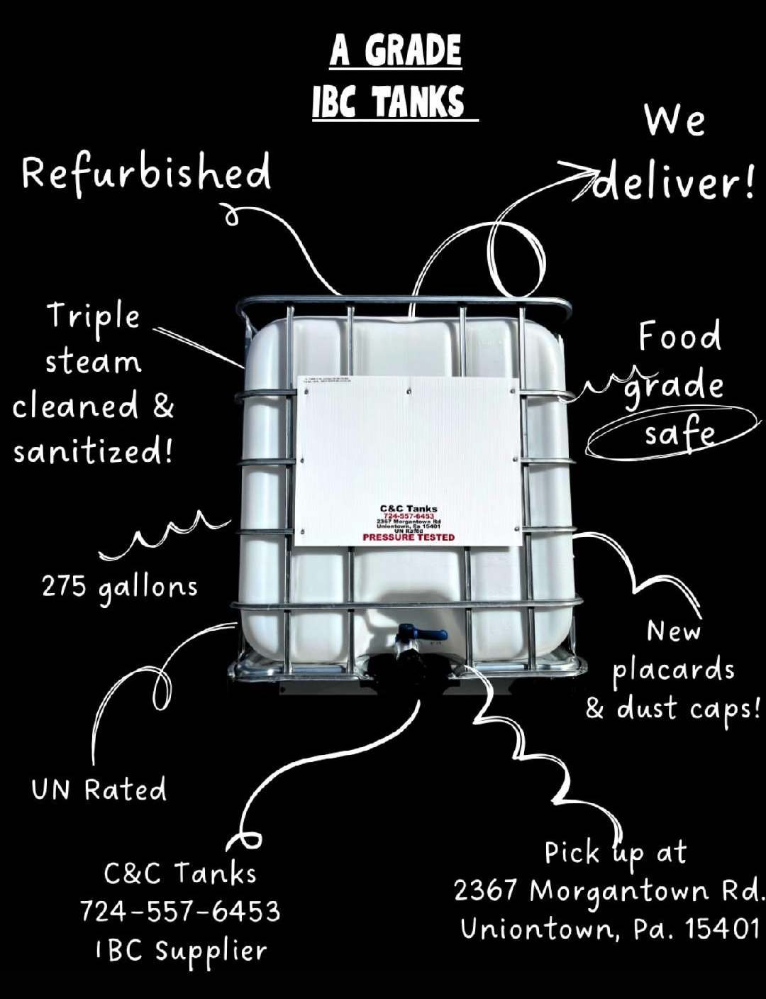 Our food-grade IBC Tanks are suitable for food contact applications, including potable drinking water, syrups, and other consumable liquids. Each tank is thoroughly steam cleaned, sanitized, and refurbished before resale. These tanks are designed to meet FDA food- contact material standards and provide a reliable, cost-effective solution for food and beverage storage needs.